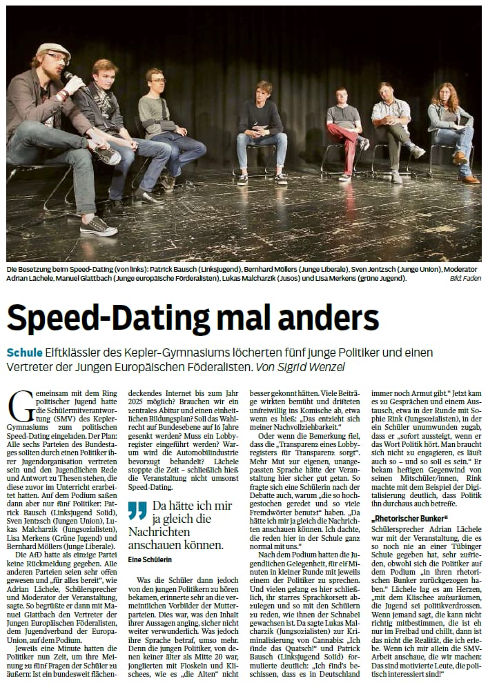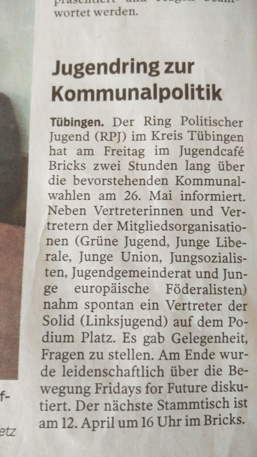 Wer wir sind: Der Ring Politischer Jugend (RPJ) Tübingen ist ein freiwilliger Zusammenschluss demokratischer Parteijugendorganisationen aus dem Landkreis Tübingen.